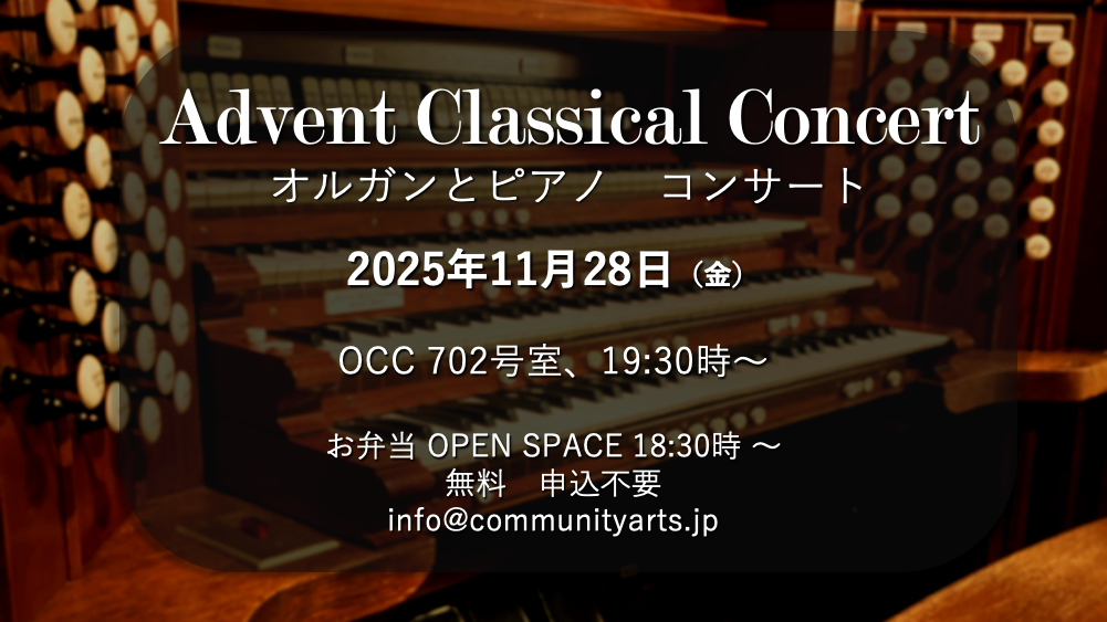 Community Arts Tokyo offers performances, lectures, symposiums, lessons, masterclasses, screenings, and exhibitions. We are responsible for a wide range of music education, from college preparation for overseas study to children exposed to music for the very first time. We remain closely connected to the professional art world in Japan through formal events (concerts, panel discussions, etc.) and informal events (fellowship dinners, sharing times, parties, etc.). We also work to connect and provide resources for churches from many denominations and groups through the arts and worship.